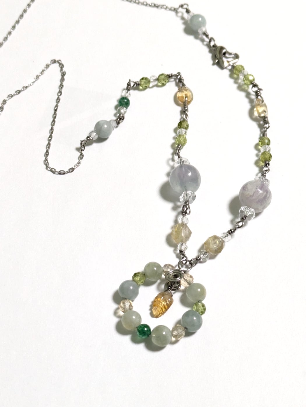 全体的にグリーンとイエローの明るい配色のネックレスです。