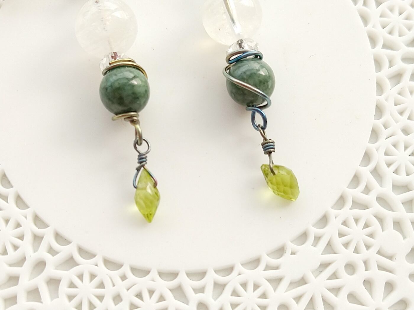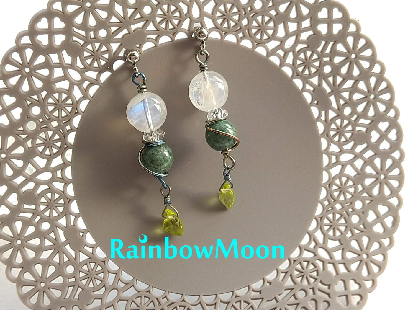 綺麗なブルーのシラーが出るブルームーンストーンに、濃いめの緑のヒスイを合わせた大人っぽいピアスです。