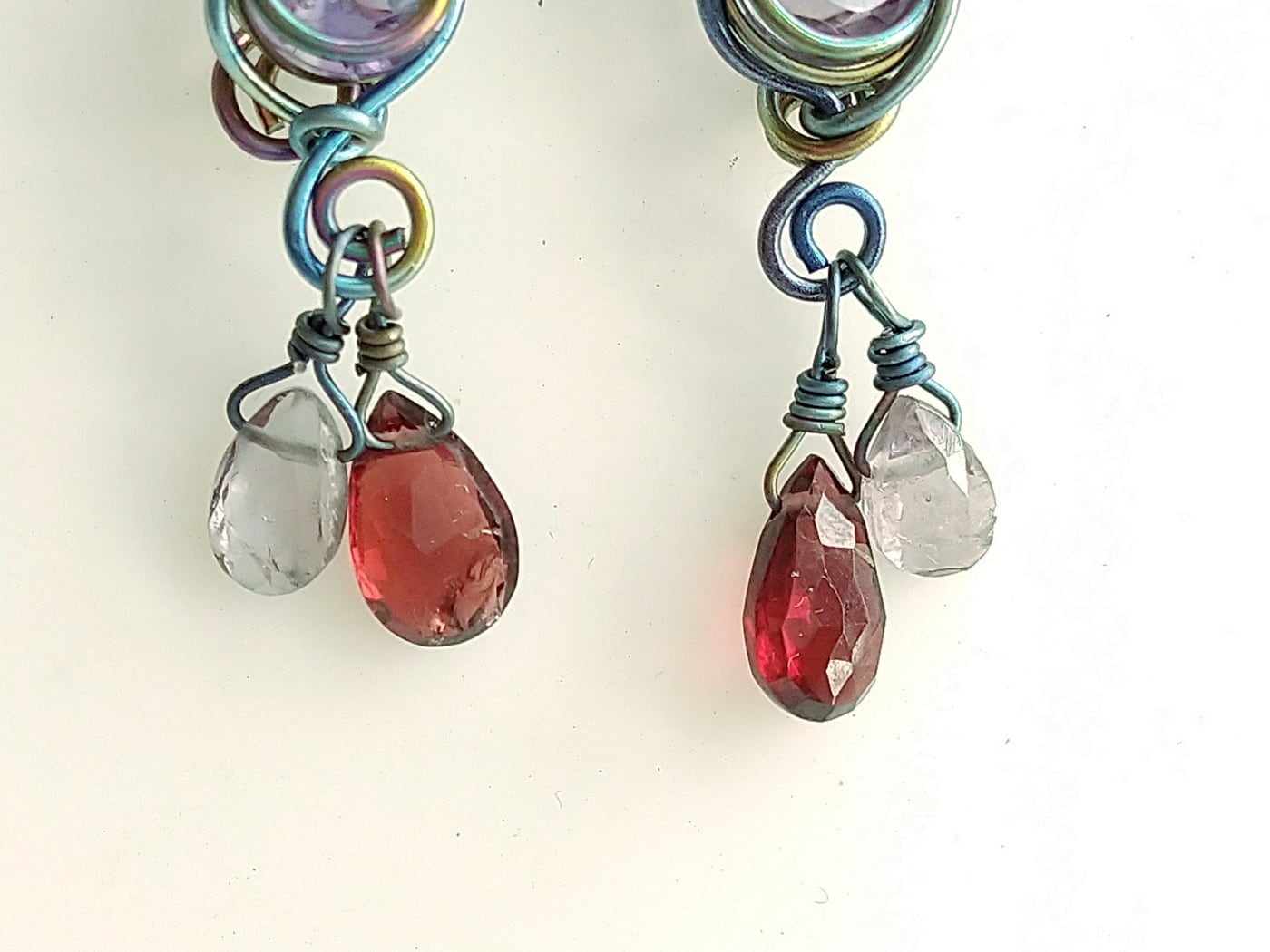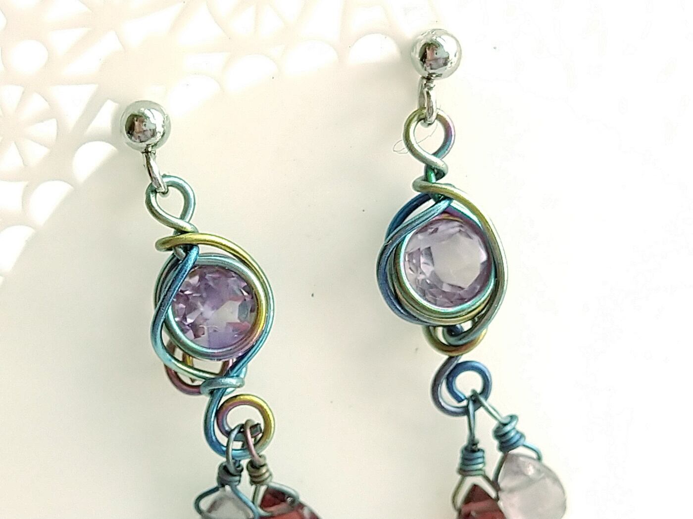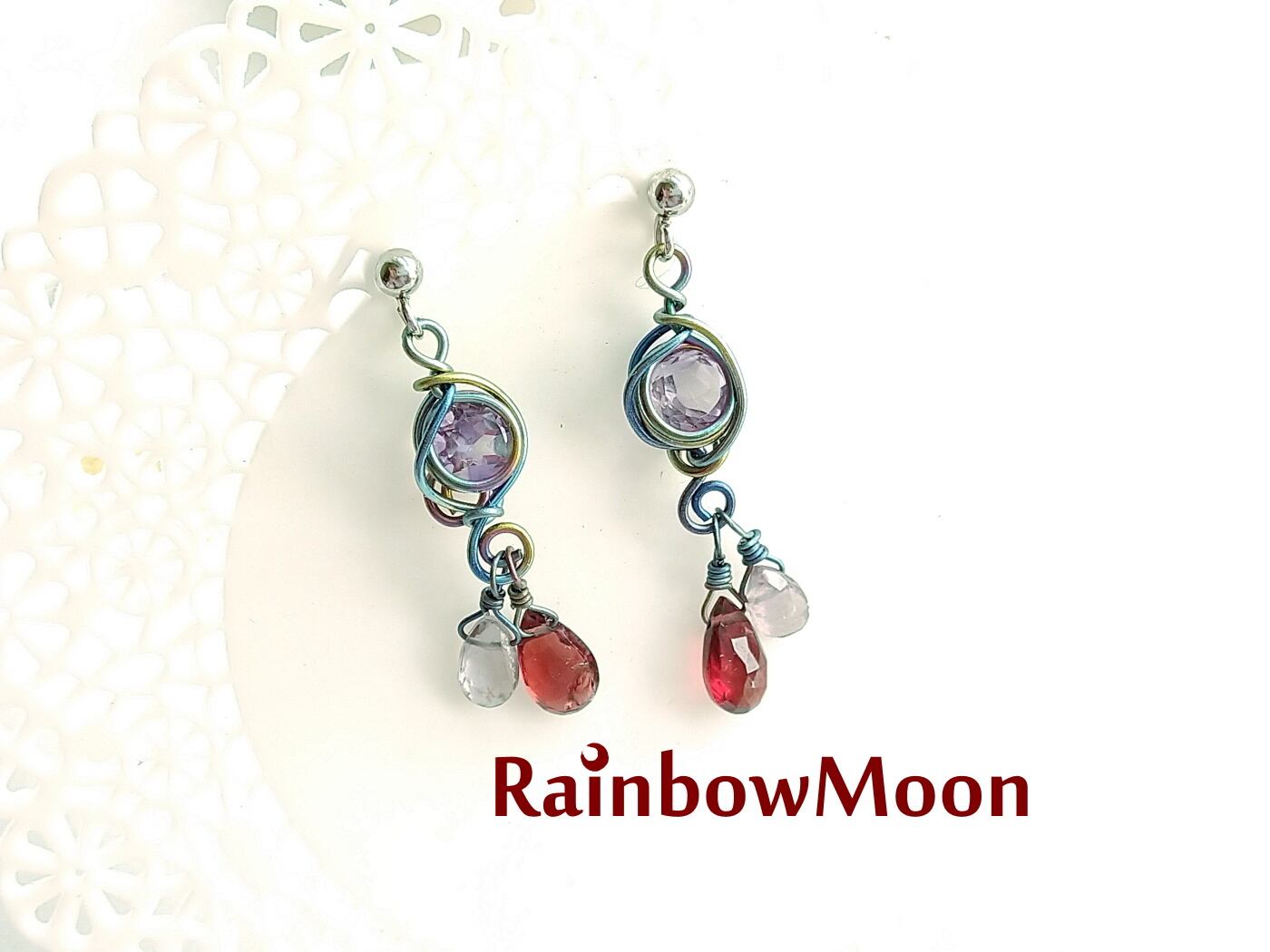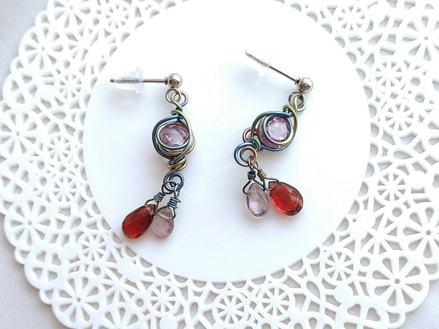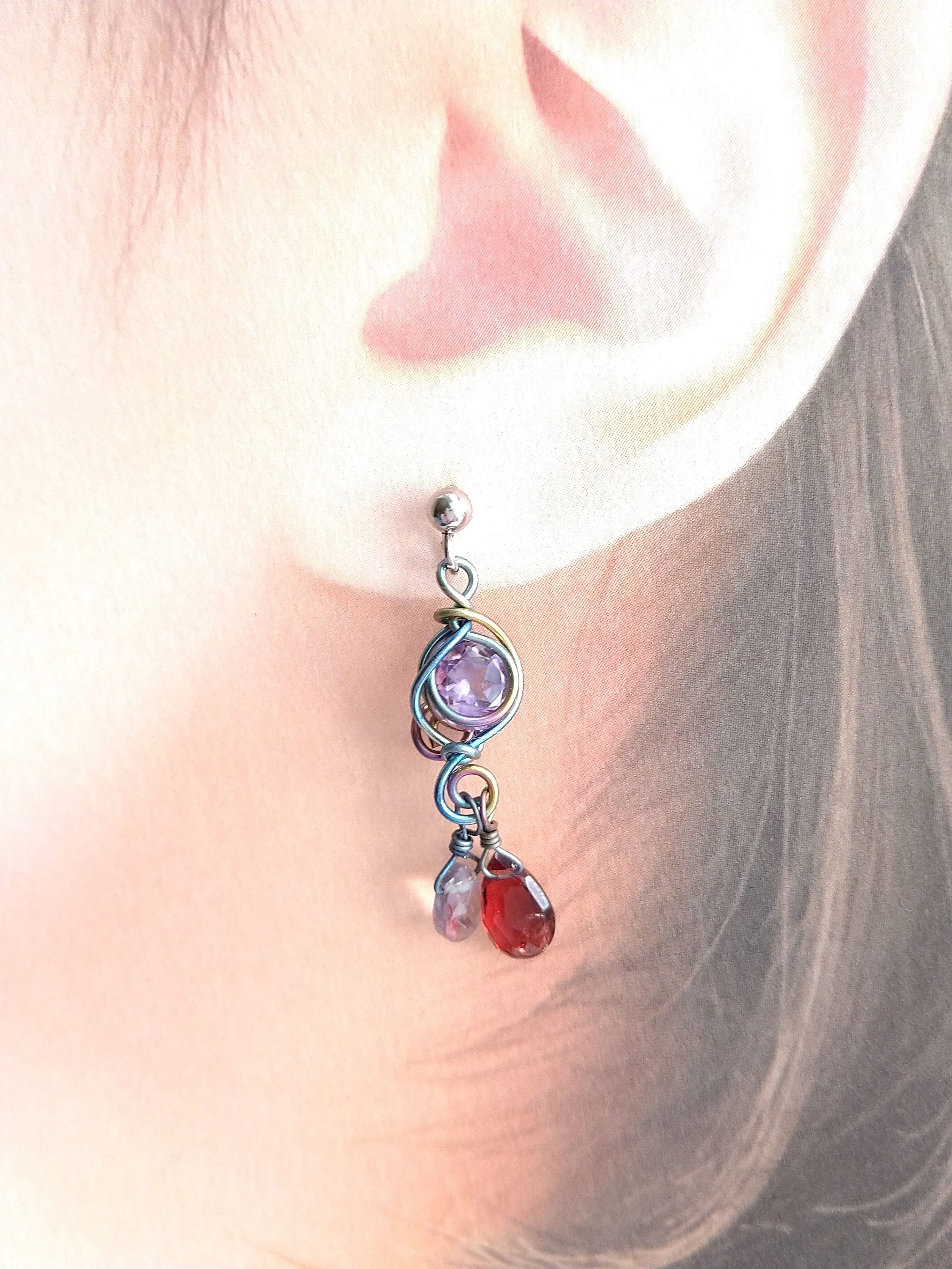 宝石カットのアメジストに赤いガーネットとうっすらグレーのスピネルのしずくが揺れるピアスです。