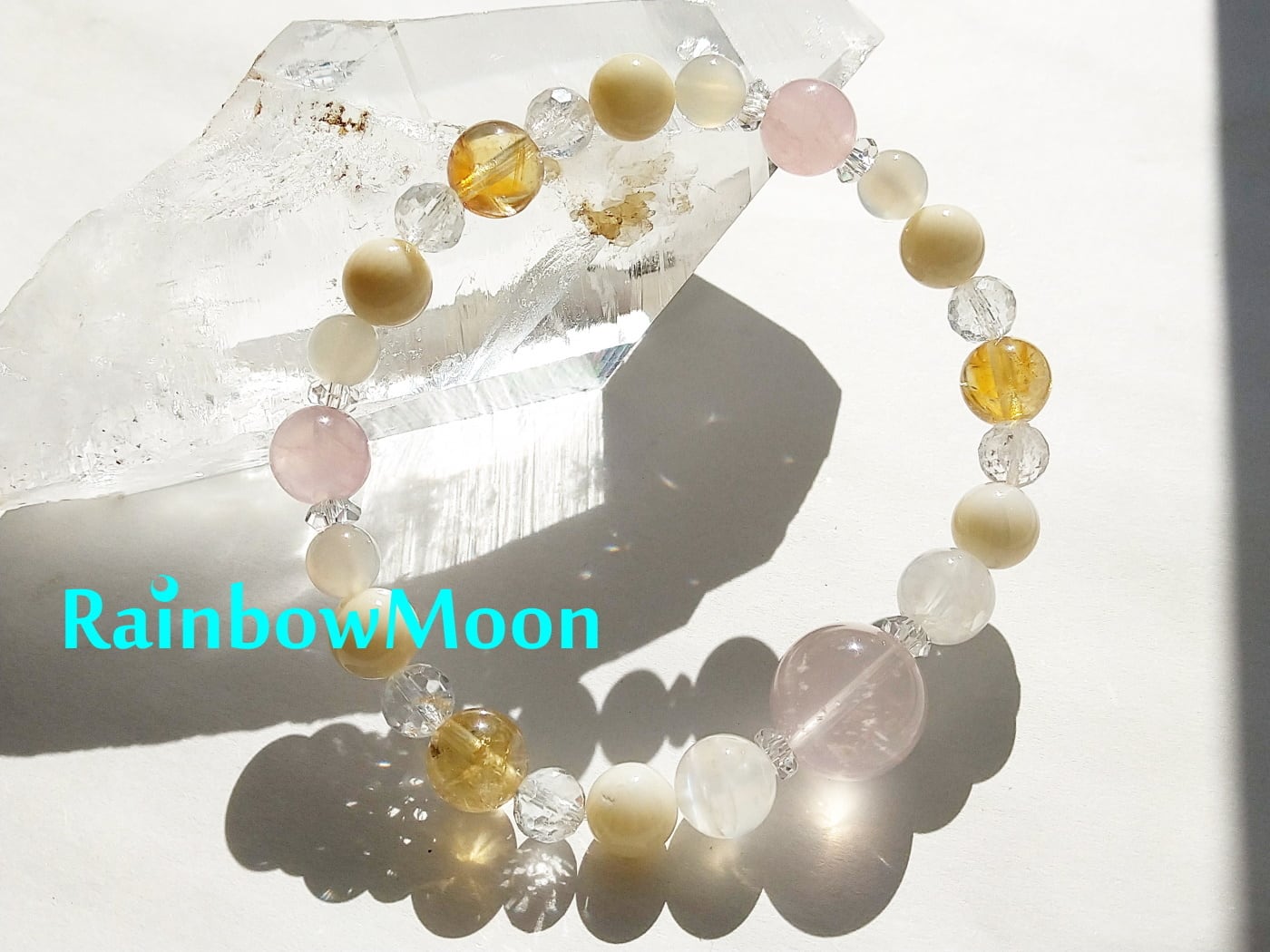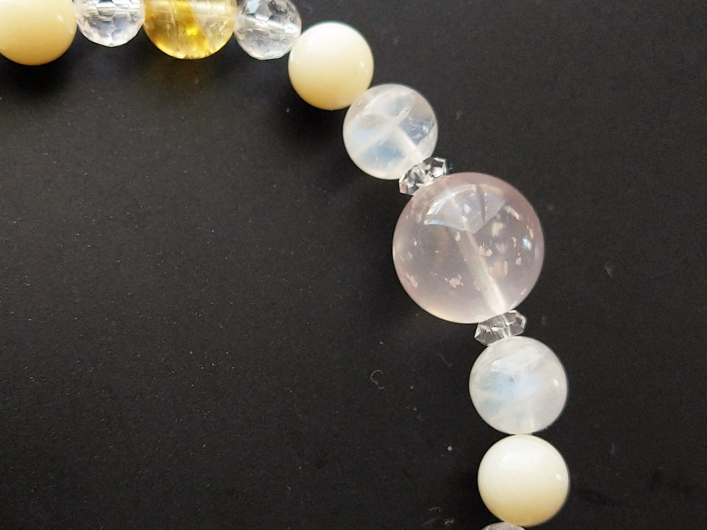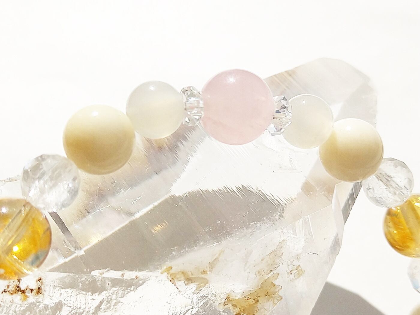 小さいローズクォーツの隣には高品質のホワイトムーンストーンを。