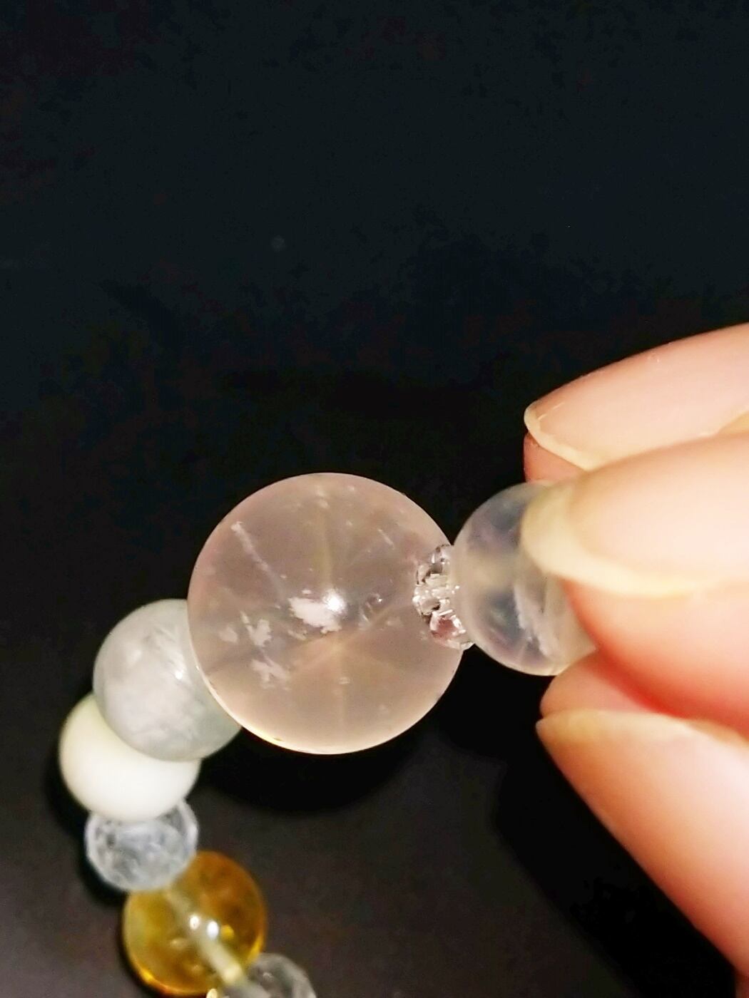 大きなローズクォーツにはセリサイトも入ってますが、ペンライトなどで光を当てると、実はスターも…見えたりします♪